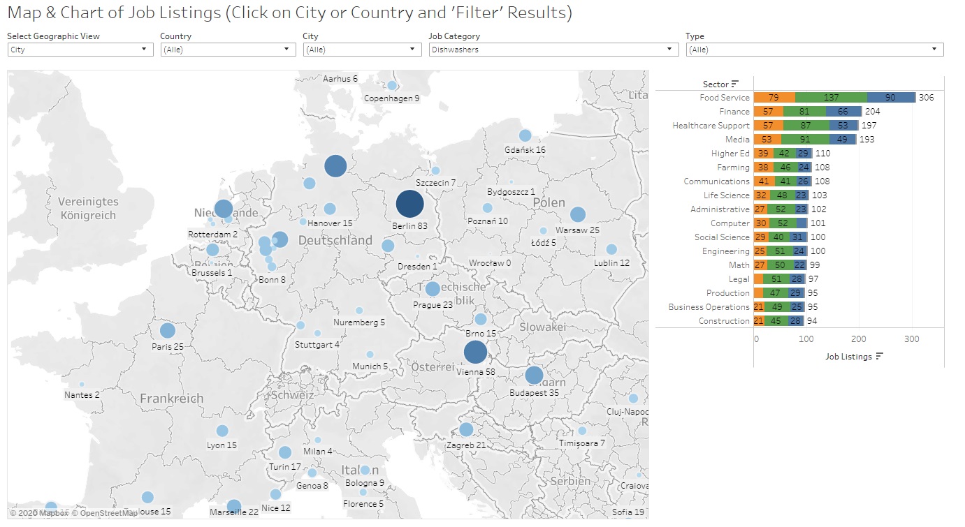 Shifting workforce helps to identify rising sectors and match them with available workforce. In order to do so, we created a platform which shows the changing needs of different sectors to enable a more efficient job-search and seamless transition from one sector to another. On this website, we offer a reliable overview of open job-offers by sector and skill as well as how demand changed in the past.